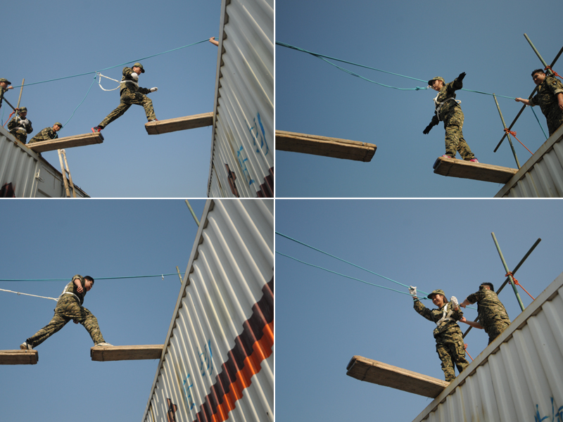 过断桥是拓展活动中一项磨练团队成员勇气和决心的有效项目,此次军训中,这项常见于青山碧水间的活动被教官巧妙的运用到房山的物流基地中,因地制宜的利用运输车辆的间距搭建了一座“断桥”。断桥看似简单,但跨过断桥却需要极大的勇气和决心,即便站在断桥的一端会心生恐惧、会心跳加速,但北京公司的全体同事都没有畏惧,因为我们明白,这断桥亦如销季中将会发生的种种困难,面对困难我们必须迎难而上,每个人的一小步,都将会成为企业迈向胜利的一大步。