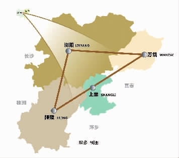 在中国的腹地,有一块地跨两省的毗邻地区,包括浏阳、醴陵、上栗、万载四县市,这里是花炮的发源地,生产花炮有1400 多年的历史;也是全球最大的花炮生产基地,全世界80%的花炮在这里生产。从地图上看,这四个县市以浏阳为中心,成三角形分布,被人们称作“中国烟花金三角”。