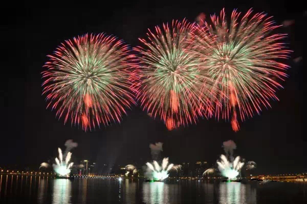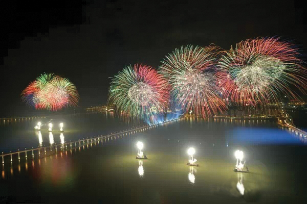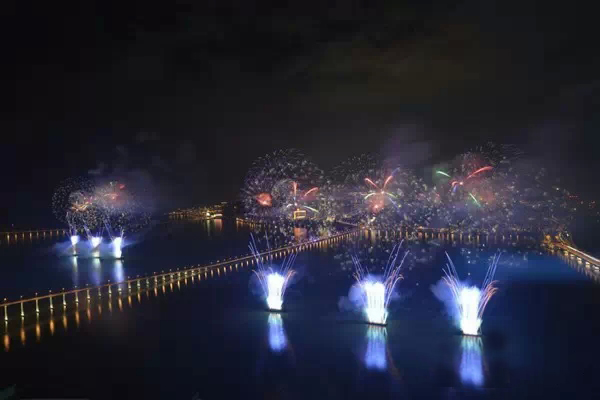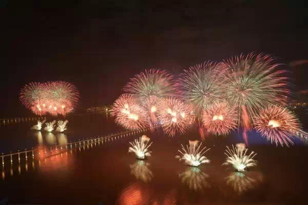 此次燃放是澳门史上最大规模灯光烟花表演。6艘千吨烟花趸船;18组海面浮台灯光;以及30组灯光;纵横各达1500米的宏伟画面。