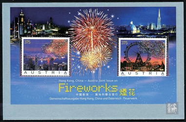 美丽的烟花让邮票设计者充满了想象,特别是一些特殊的工艺,更使得烟花邮票亮点不少。泰国邮政在2010年发行的烟花邮票,添加了闪光银粉釉面特殊印刷。而最让人叫绝的是2006年中国香港邮政和奥地利邮政联合发行的《烟花》特别邮票,两枚图案分别以香港著名的维多利亚港湾和奥地利维也纳普拉特公园为背景,同取夜空下烟花盛放的欢乐场景。引人瞩目的是,设计者巧妙地将人造水晶饰布压制在邮票画面的烟花部分,利用水晶的高折射度凝住烟花乍放的绚丽,当点点光华映照在水晶石上,会散发耀目的光芒,闪烁生辉,使图案更为璀璨迷人,赏心悦目。