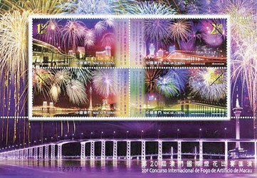 一些国家和地区的烟花汇演也形成了一个独特的品牌,像由澳门特别行政区政府旅游局主办的“澳门国际烟花比赛汇演”始于1989年,当时只有五支队伍参赛。直至1995年,烟花汇演向前跨进一步,由原来的五支参赛队伍增加到十支,每晚由两支不同队伍表演,成为澳门一项国际性盛事,在世界上同类形比赛汇演中极具规模及地位,中国澳门邮政也多次发行澳门国际烟花比赛汇演纪念邮票和小全张。(图5为2008年第20届澳门国际烟花比赛汇演小全张)