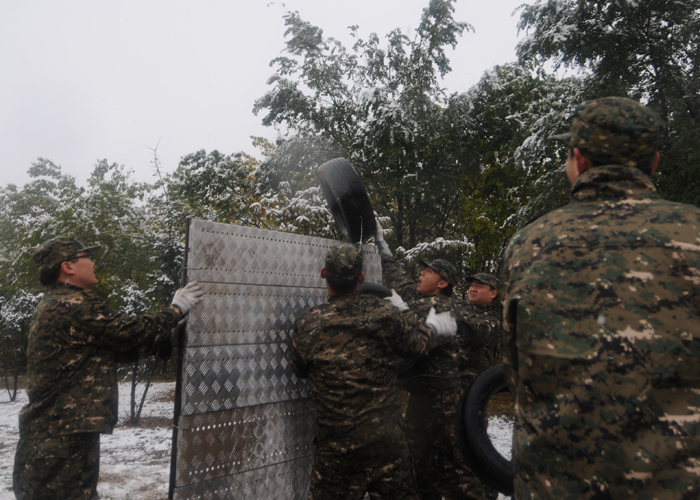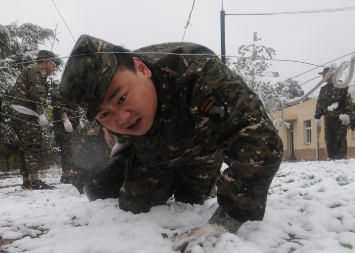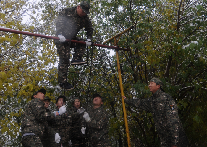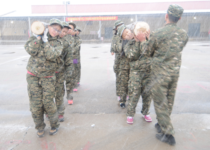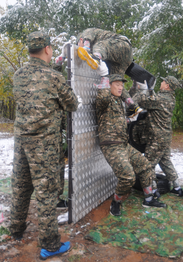 第一天的拓展训练很快就开始了。早5点起来用餐后,天空开始飘雪,但所有成员都不惧寒冷,坚持训练。