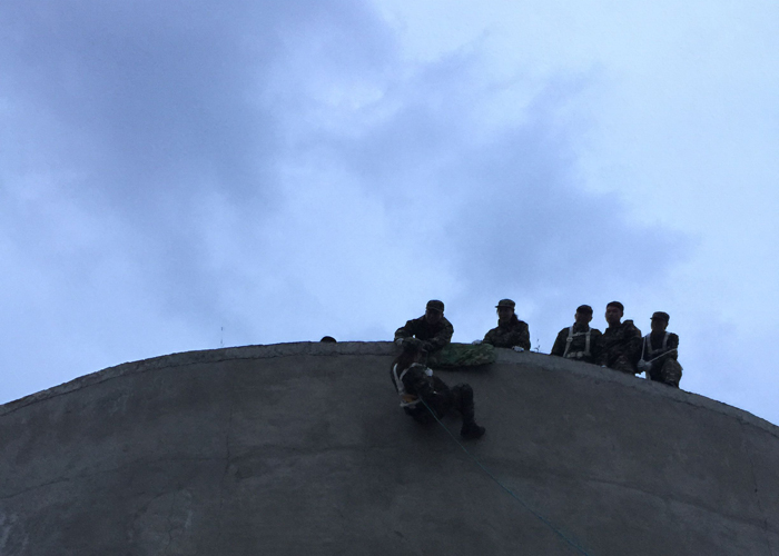 拓训练的第二个项目“空中速降”,它是一个个人挑战项目,要求队员们在9米高的蓄水池背面降落。当挑战者一步一步爬上9米高空之时,脚下仅仅是不足一米的狭窄过道,所有成员均成功降落到地面,体现了熊猫人的风采。