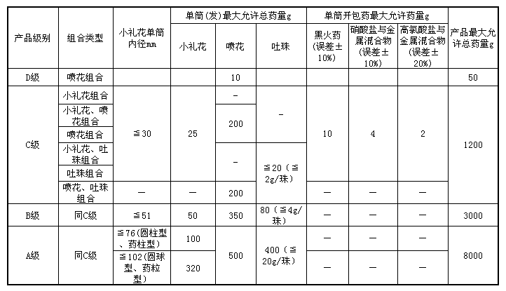 喷花类:个人燃放类圆柱型内径≦52mm,圆椎型内径≦86mm;